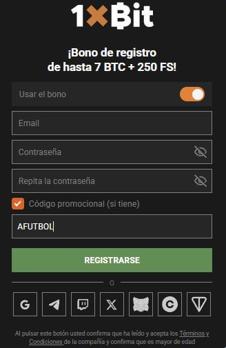 Basta con esos tres campos, AFUTBOL en el código promocional, y clicar en el botón verde REGISTRARSE, para crear una nueva cuenta con el código promocional AFUTBOL. Puedes ir directamente al formultario de alta clicando este enlace al formulario de alta en 1xbit